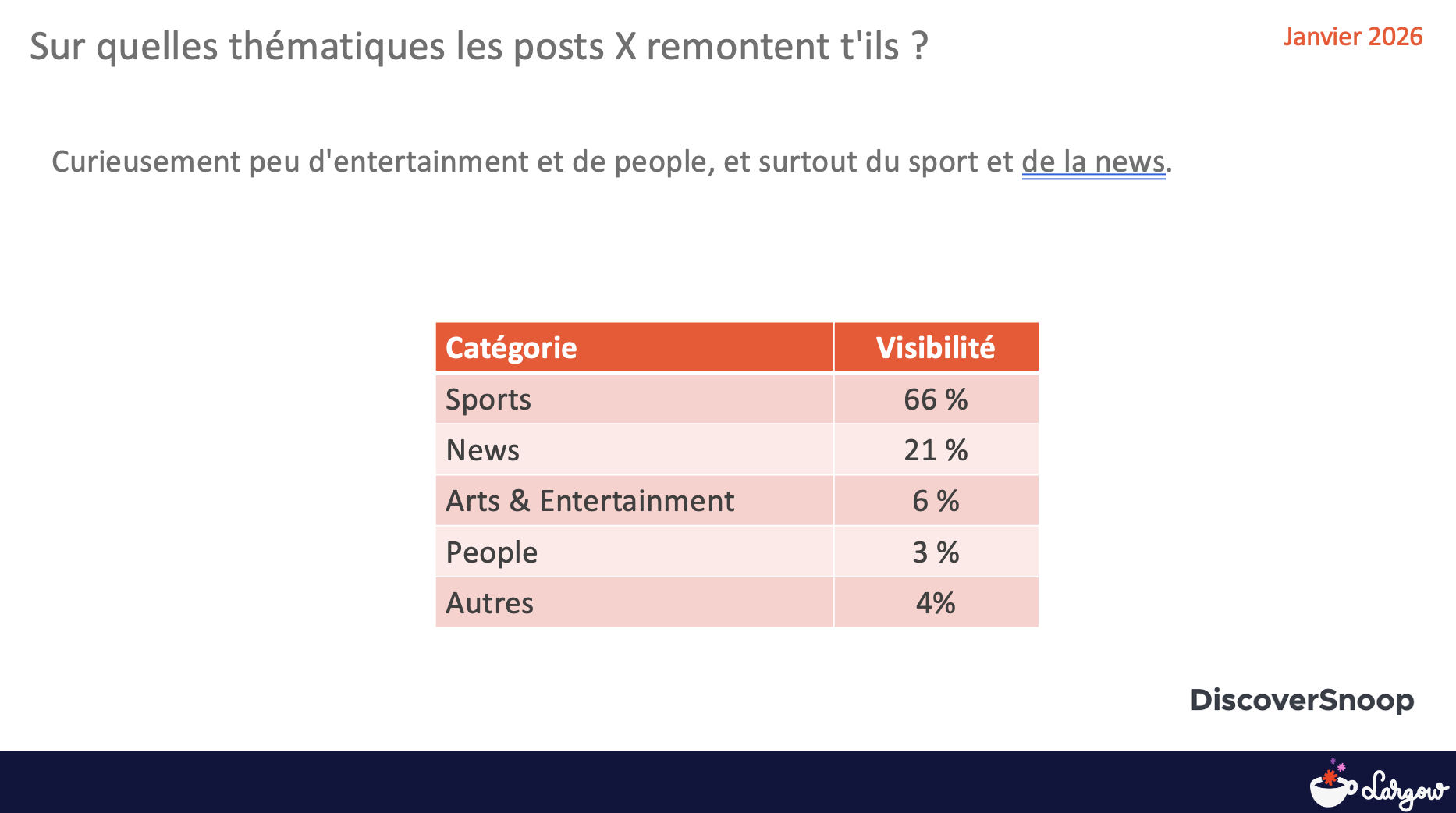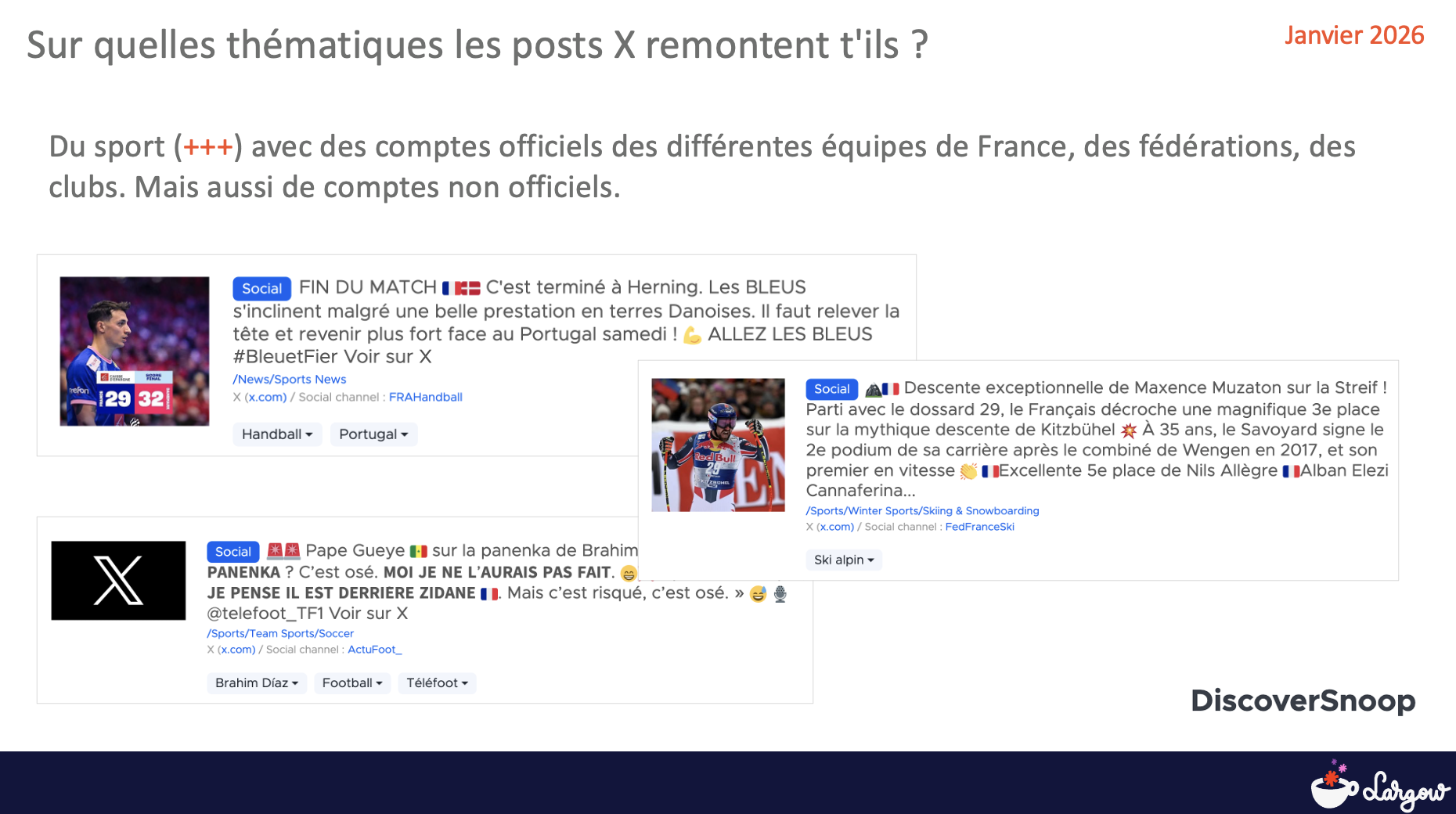 X (ex Twitter), dont la visibilité est importante seulement depuis décembre fait une entrée fracassante, en prenant la 24è place en seulement quelques semaines de visibilité. Les posts colonisent le bas de page (souvent entre la 20 et la 25è position), générant des impressions en masse sur Discover. On attend l'arrivée prochaine d'Instagram et Tiktok, annoncé officiellement à Zurich en décembre.